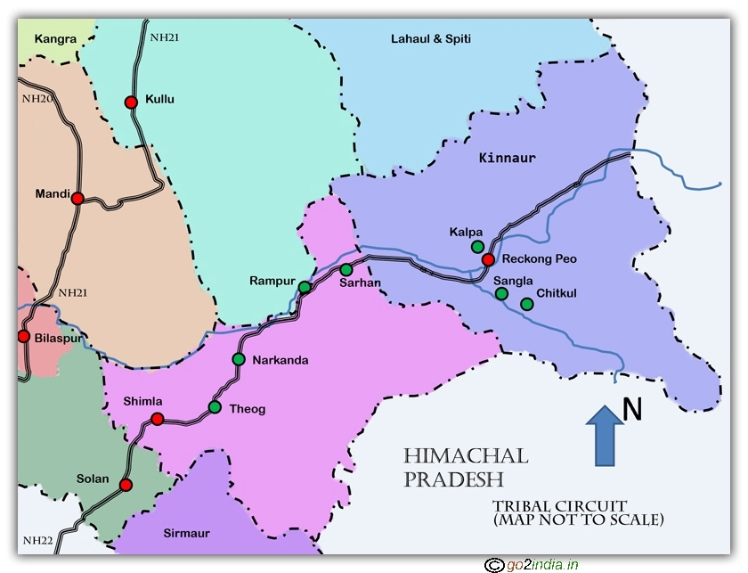 Carry your woolen clothes with you even in clear weather conditions to face the cold wind blowing here. Click the image at the side to see the large road map indicating places in the tribal circuit of Himachal Pradesh
